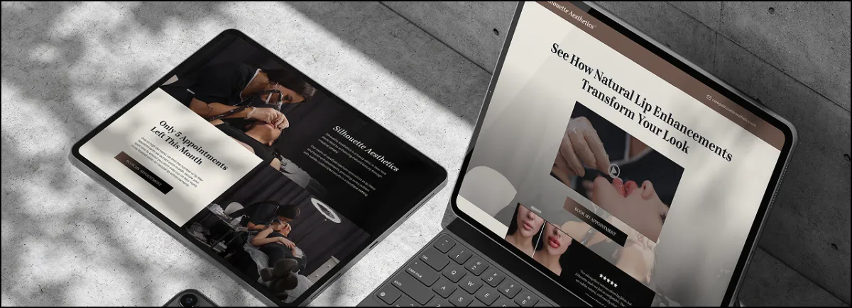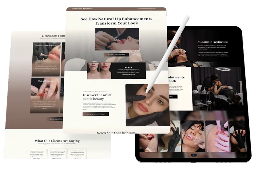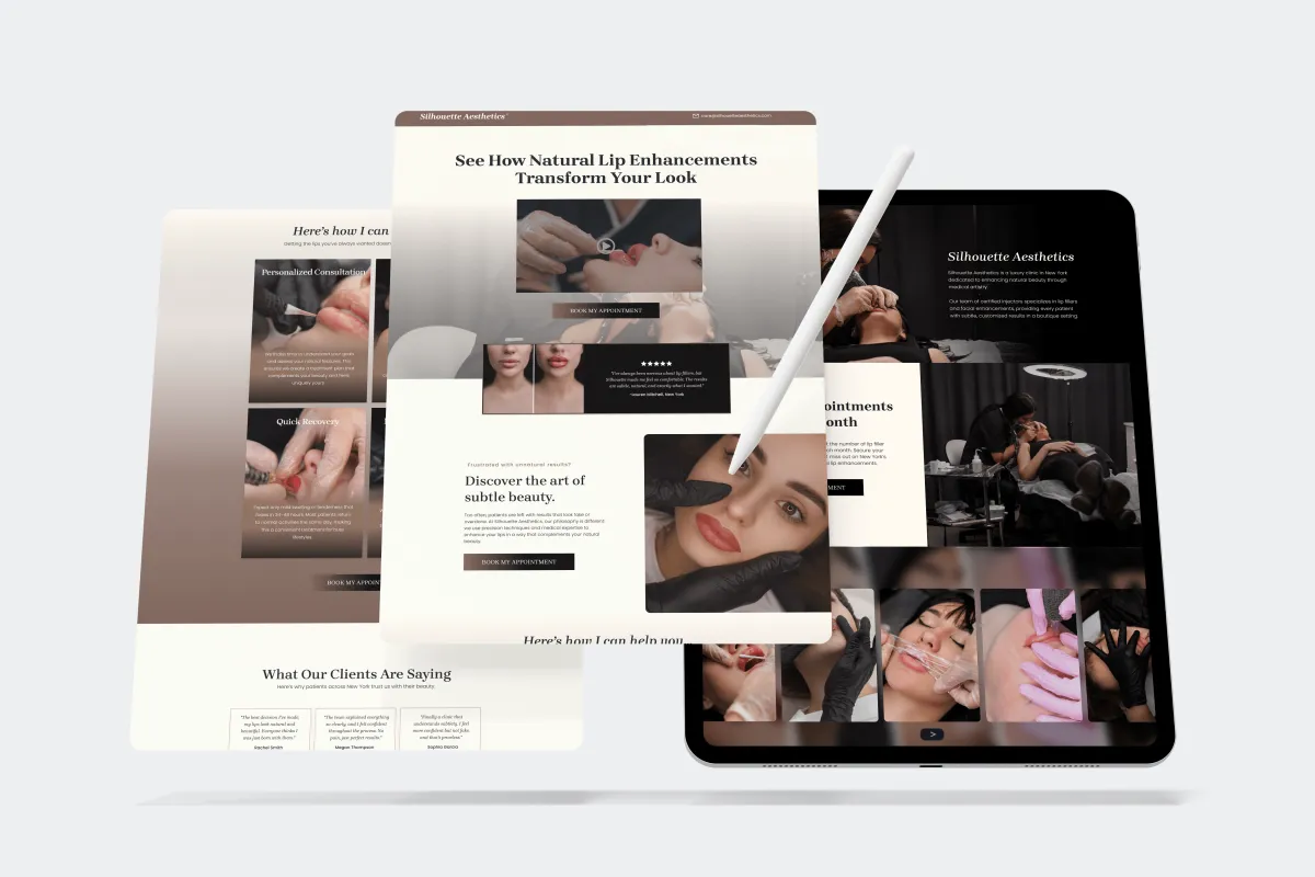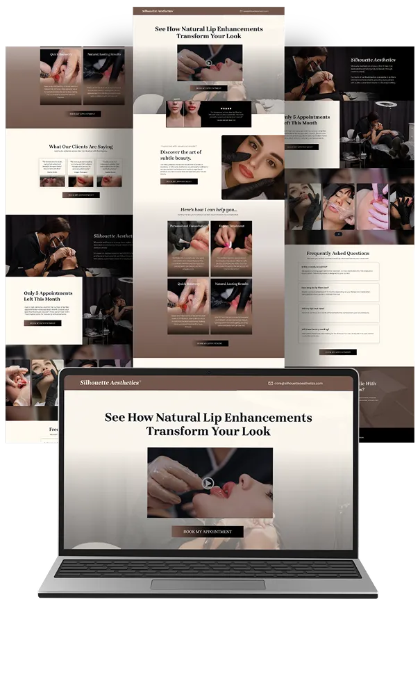 The Silhouette Aesthetics funnel captures the luxury of lip enhancement services while streamlining the booking process. Designed to showcase results, highlight expertise, and create urgency, this system turns beauty seekers into booked appointments. Every detail - from the muted tones to the social proof - was built to drive revenue effortlessly.