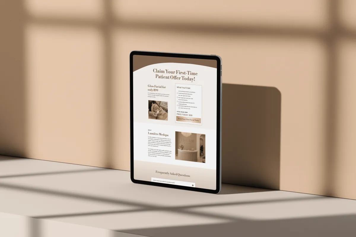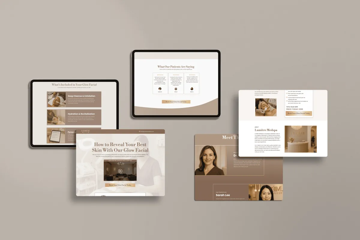 This lead-generation funnel was designed to help Lumière Medspa convert visitors into first-time facial clients. With clear service breakdowns, social proof, and limited-time offers, this funnel builds trust while driving instant action. The layout blends education, credibility, and conversion-focused design - creating a seamless path from interest to booking.